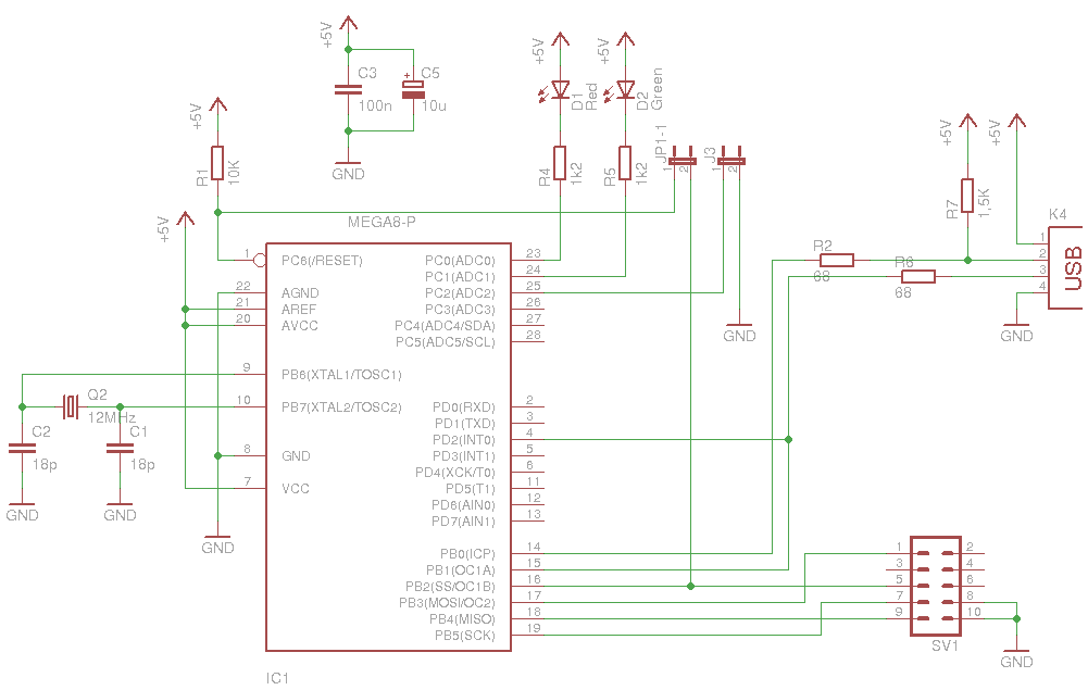 Een USB programmer kan kant en klaar worden gekocht voor ong. € 30,-. Er bestaat een duitstalige website met een simpele zelfbouw schakeling met 1 ATmega8, kosten ong € 10,- (Afb. 1). Een nadeel van zelfbouwen is dat er een extra programmer nodig is om de zelfgebouwde USB programmer te programmeren. Indien u wel zelf kunt solderen, maar nog geen programmer heeft, kunt u dit probleem omzeilen door een zelfbouwkit met voorgeprogrammeerde controller te kopen voor ong. € 20,-.