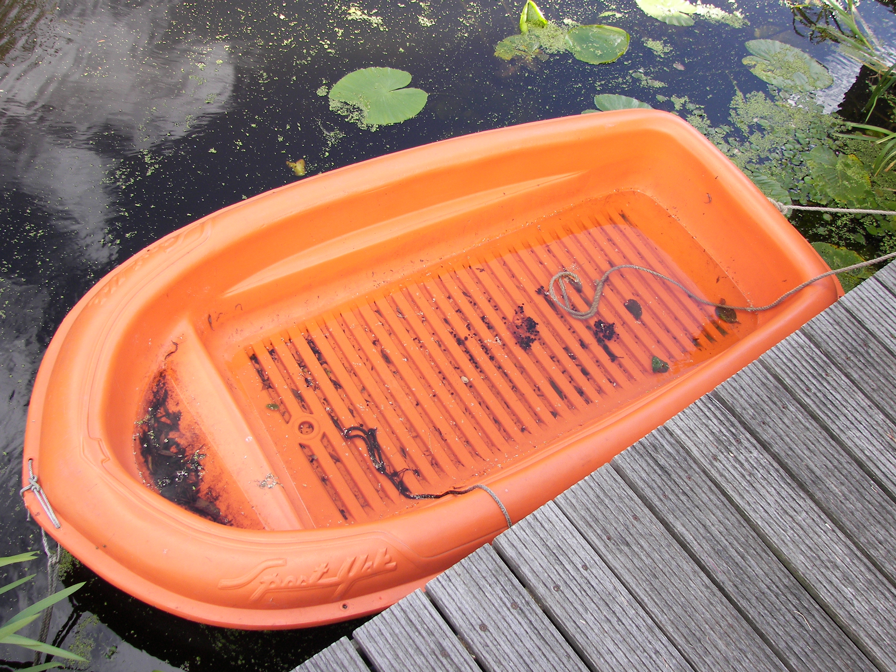 Tja, je moet ergens mee beginnen op het water. Dit kleine bootje is een zogenaamde: Sportyak ofwel een Bic Boat 200. Ik heb zelf in 1966 leren zeilen in een dergelijk bootje met zijzwaarden. Bij een windvlaag lag hij om. Maar zinken kon hij niet. En nog steeds niet. Daarom is dit bootje geschikt voor robot experimenten. Met afmetingen van een lengte: 213 cm en een breedte 115 cm past deze boot in de vele boereslootjes. Het gewicht van het bootje is 19 kg. Het is gemaakt van polyethyleen.