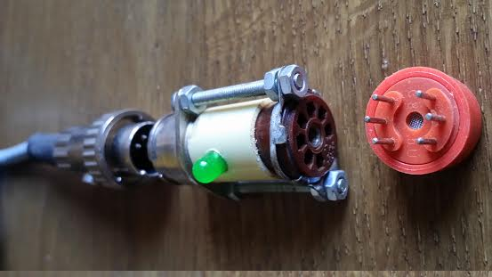 De aansluiting is gemakkelijk. De sensor bevat 6 aansluitpinnen, gegroepeerd in 2 groepjes van 3 pinnen die symetrisch tegenover elkaar staan. De middelste pen van ieder groepje is de aansluiting van het verwarmingselement. Dit element moet worden gevoed met 5V. De polariteit maakt niet uit, sterker nog, het mag zelfs wisselspanning zijn. Van de 4 overblijvende pennen zijn de pennen die ieder aan 1 kant zitten gelijk. Ook hier maakt de polariteit niet uit. Als voetje gebruik ik het voetje van een ouderwetse buis. De sensor kan er welliswaar op 2 verschillende manieren worden ingezet, maar dat maakt voor de correcte werking niets uit.