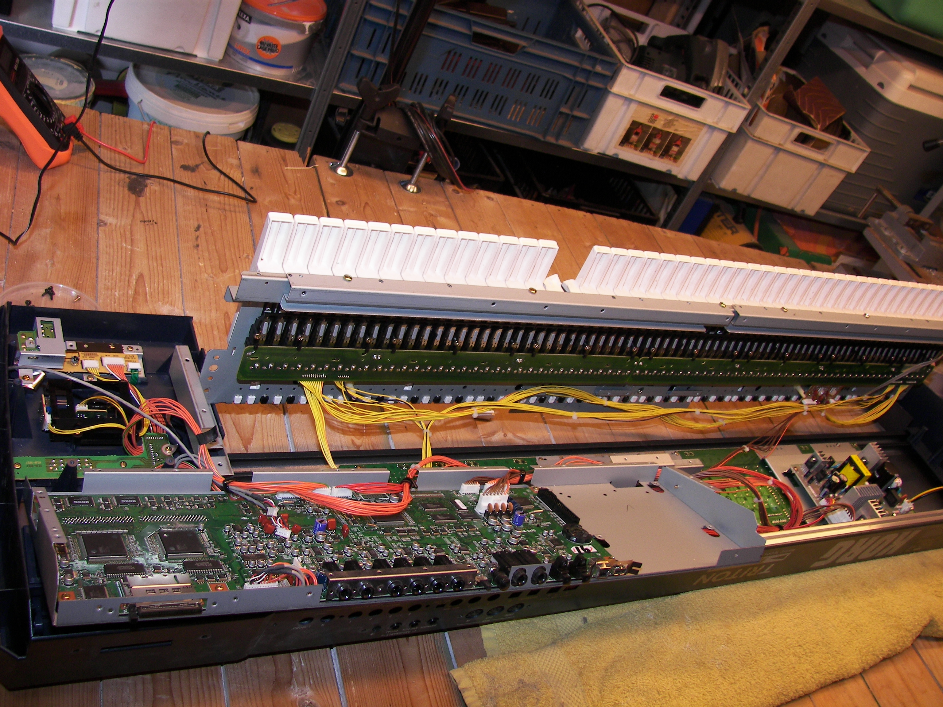 If ordering new keys be sure to know the very exact model of your keyboard, since Korg is using keystrips of other vendors, depending per model. This board is using Yamaha keystrips. The keyboard is constructed upside down, so destructing it must be done upside down as well.