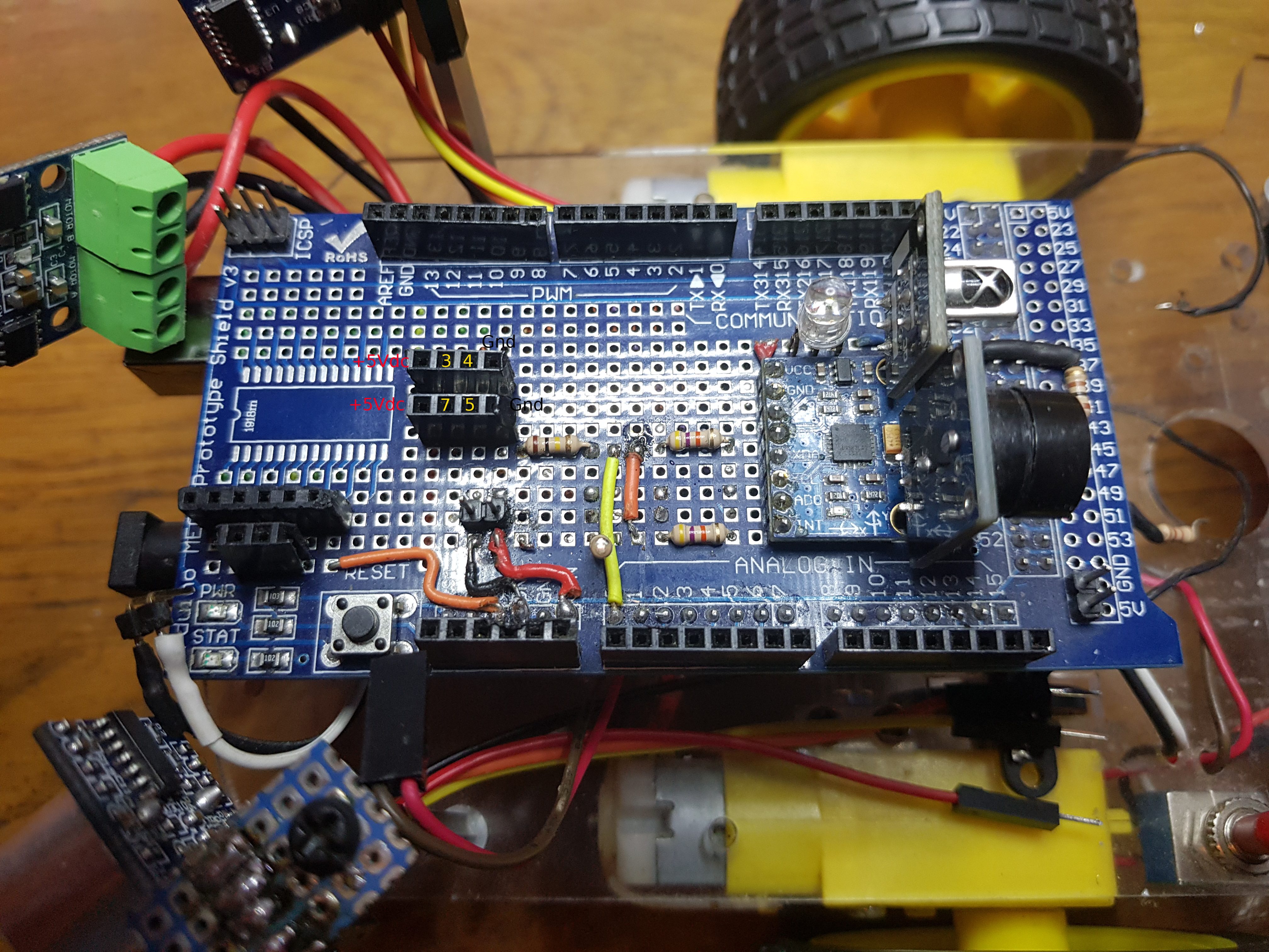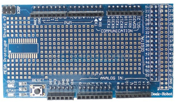 Deze schildjes worden voorzien van een aantal aansluitingen voor componenten die in vrijwel alle robots worden gebruikt, zoals bijvoorbeeld een 3-kleuren LED, een buzzer en een internetverbinding. Dit laat meer ruimte op het breadboard voor de rest van het project. Bovendien zijn de verbindingen betrouwbaarder dan op een breadboard. Dit schild bevat 2 LEDs: 1 voor power en 1 parallel aan de RS232 ingang.