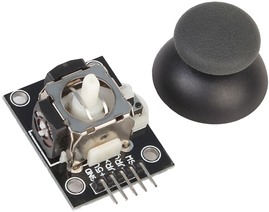 This little joystick is often used as a game controller. It contains an X-axis, Y-axis and a push-switch. If you define the connections as North, then the North reads Y=0 while the South reads Y=1023. In the same manner East reads X=0 while West reads X=1023. The switch reads a 1 unless it is pushed. While it is pushed it reads 0.