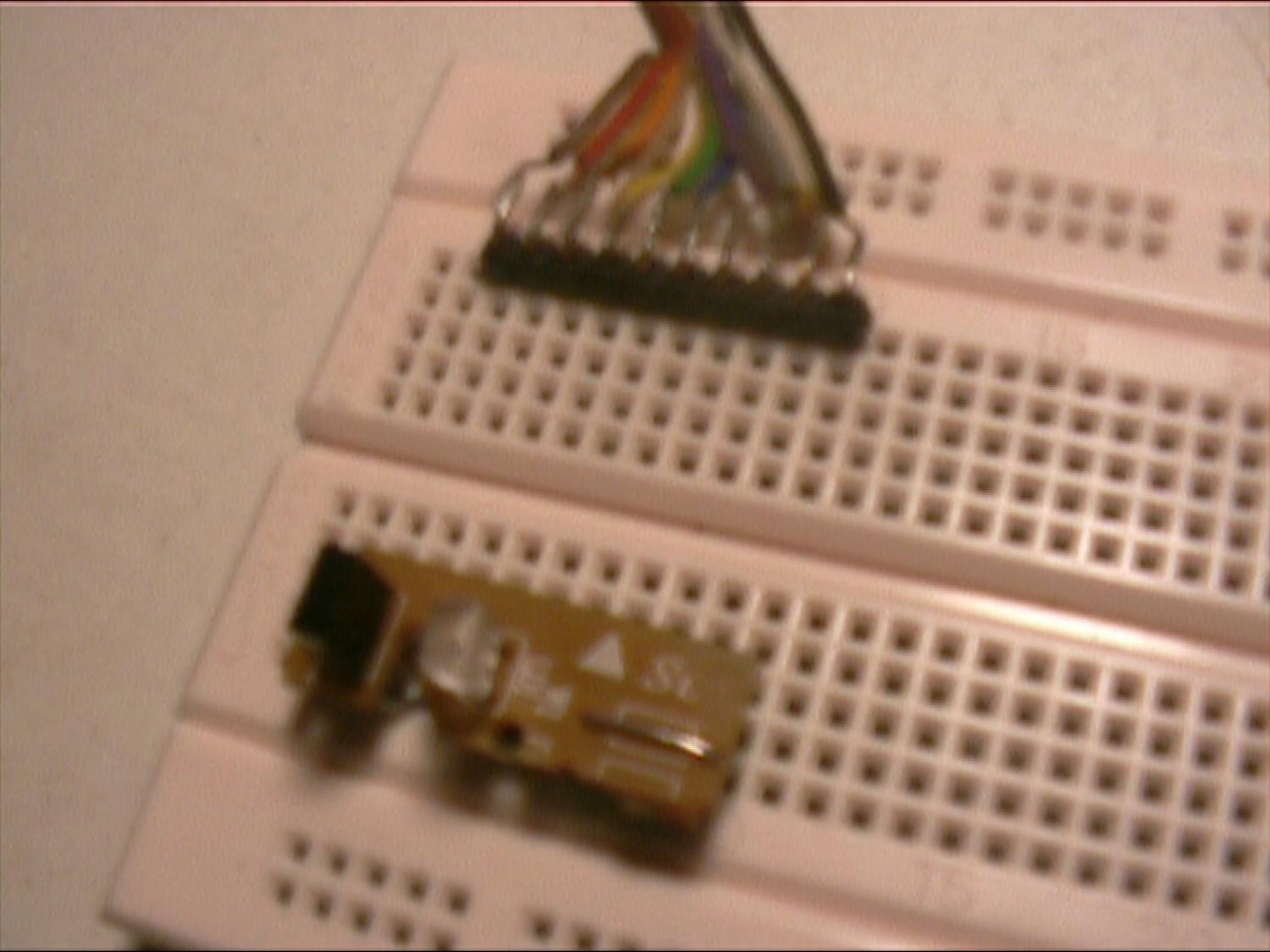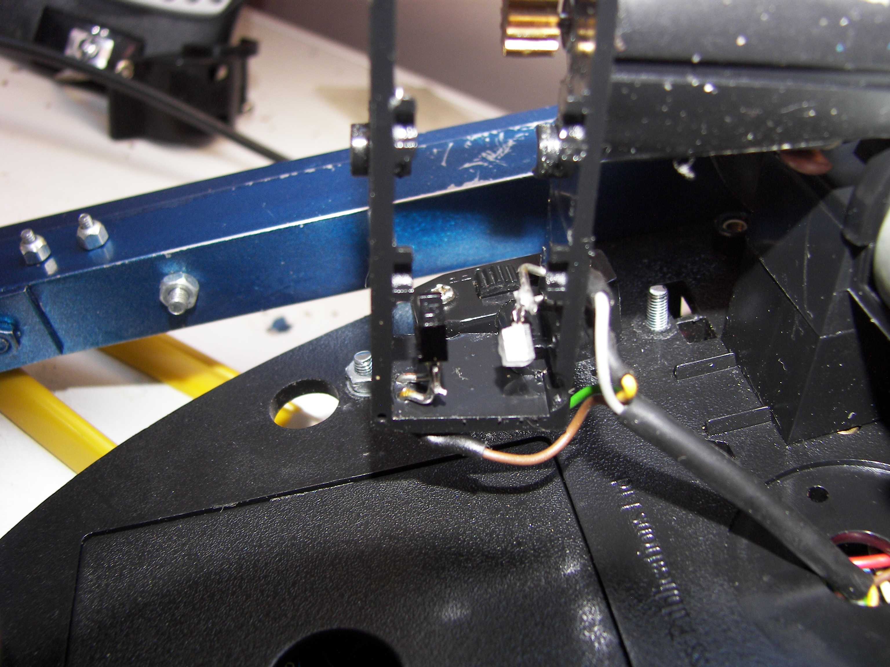Een lampje en een lichtsensor zijn gemonteerd aan weerszijden van een tandwieltje met gaatjes. Allereerst heb ik een muis gesloopt en een testopstelling op mijn breadboard gemaakt. Daaruit blijkt voor de onderdelen die uit mijn Logitech First / Pilot Wheel Mouse komen op de volgende manier moeten worden aangesloten om een effect te kunnen zien. LED (liggend op de rug met de pins naar mij toe) heeft 3 pins. De middelste is niet doorgevoerd of aangesloten. De linker (grijs) gaat via een 270 Ohm weerstand naar de aarde. De rechter (geel) gaat naar de 5Vdc. Ook de IR-sensor heeft 3 pennen. De beschrijving is ook liggend op de rug met de pennen naar mij toe. Het uitstekende nokje is dus de rug van de sensor. De linker is niet aangesloten. De middelste (bruin) is via een 270 Ohm weerstand aangesloten op de D/A convertor van een ATmega16 op een STK500. De rechter draad (groen) is aangesloten op de aarde.