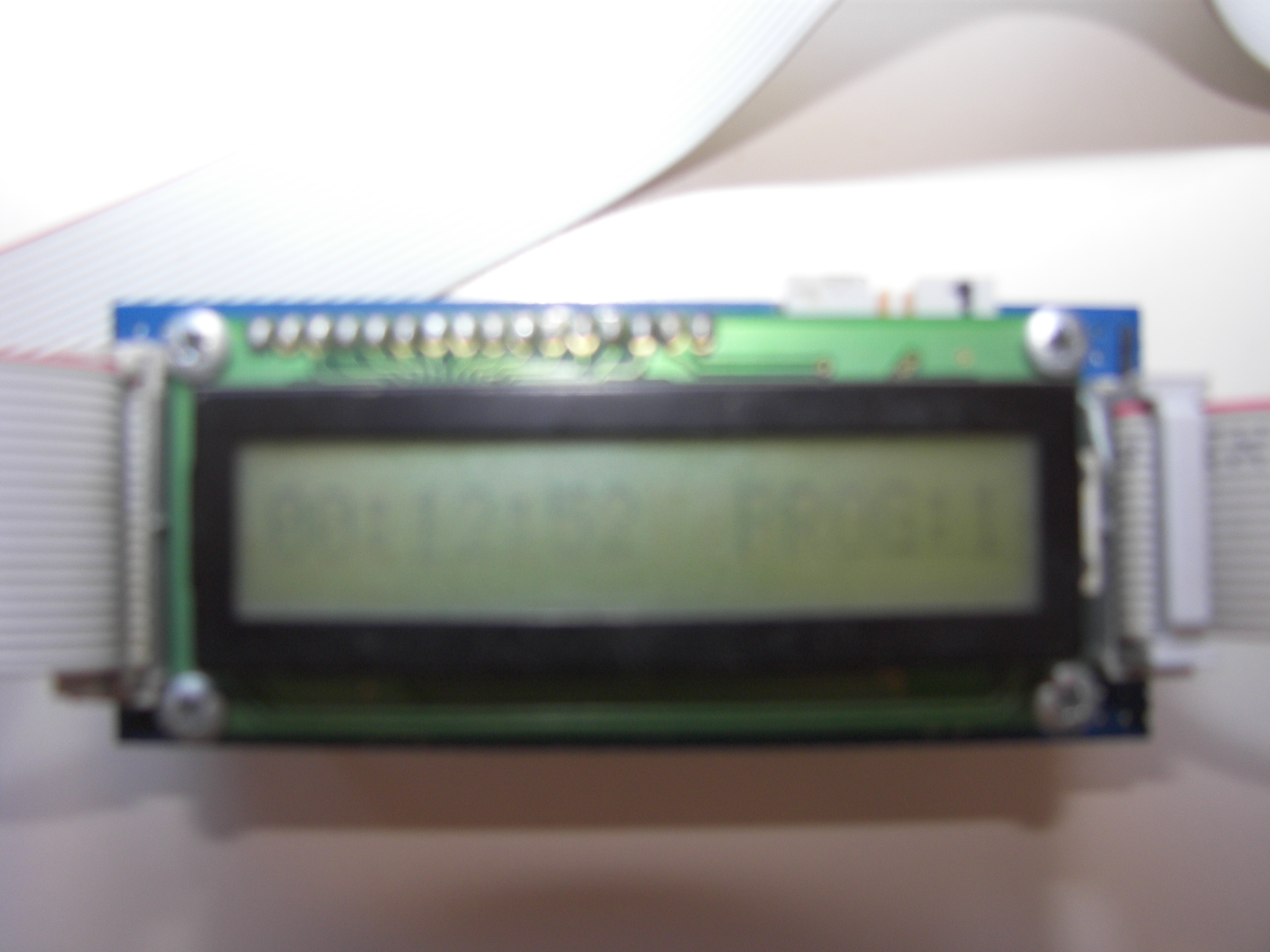 | Je moet zelf een stripje van 16 pins solderen aan deze print. Verder heb je om het contrast in te stellen een instelpotmeter nodig van 10kΩ. De loper van deze potmeter moet worden aangesloten op pin 3 van de LCD. Verder moet de ene poot op de 5Vdc worden aangesloten en de andere poot op de aarde. Zo functioneert je potmeter als spanningsdeler en kan je met de afgenomen spanning traploos het contrast instellen. De 5Vdc moet ook worden aangesloten op pin 2 en de aarde moet ook worden aangesloten op pin 1. Om de achtergrondverlichting aan te krijgen heb ik 16 (Kathode) aangesloten op de aarde en pin 15 (Anode) op de 5Vdc. Dit is eigenlijk te veel want het moet 4,2 Vdc zijn. Met een tweede instelpotmeter van 4k7Ω als spanningsdeler waarvan de loper wordt aangesloten op de anode (pin 15) heb je ook een traploze helderheidsregelaar.