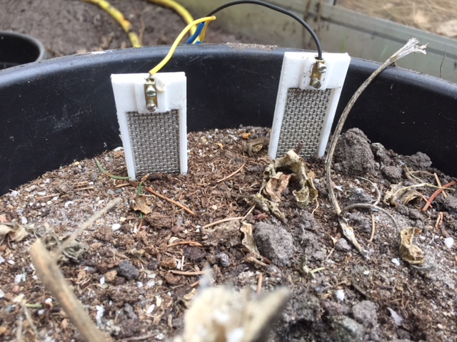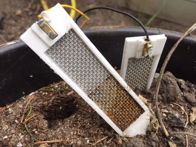 | Deze sondes zijn gemaakt door neef Jan. Hij heeft ze 3D-geprint. Zij zijn van RVS en PVC? en bedoeld om de vochtigheid van de grond te meten. Dat kan op vele manieren. Bekijk daarom eerst eens een beetje theorie. |