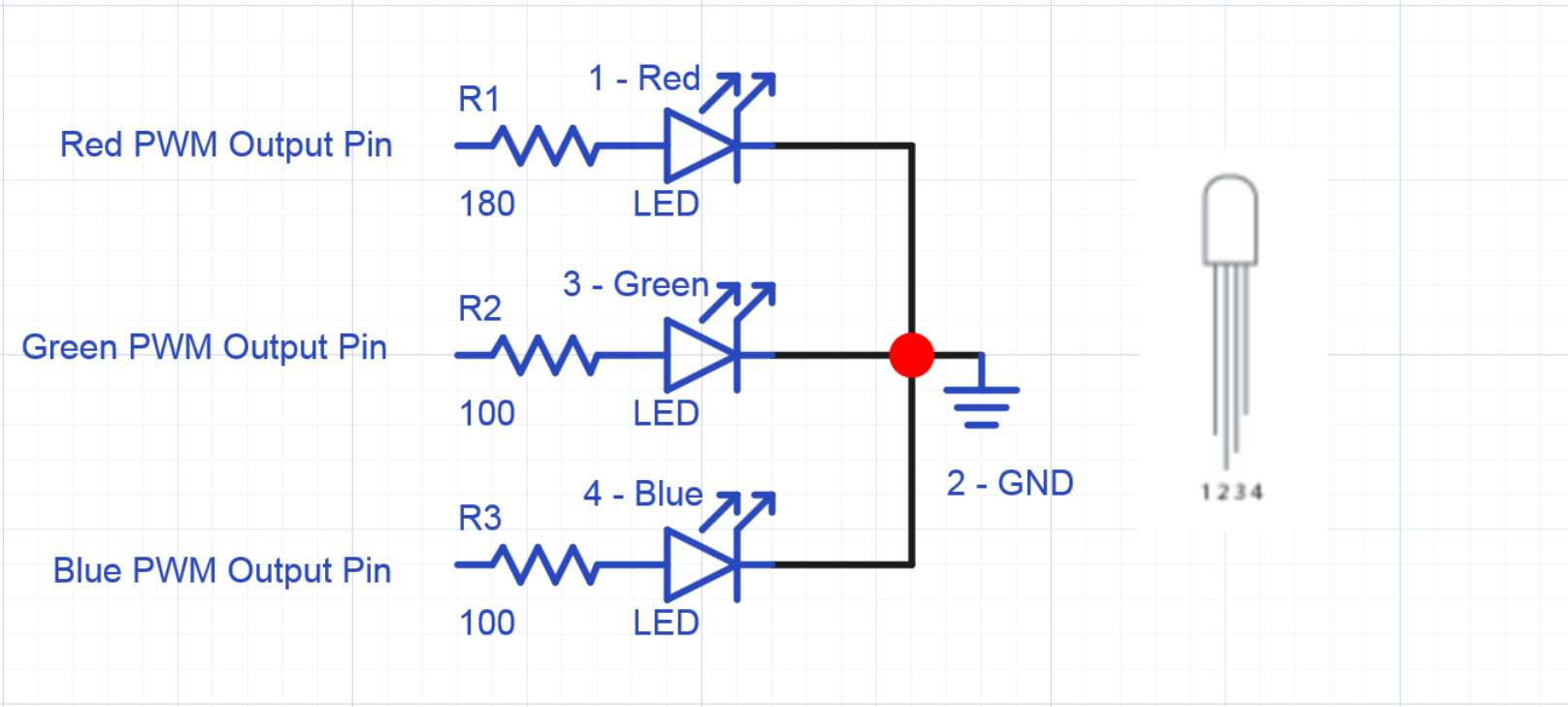 De RGB Led bestaat eigenlijk uit 3 Leds die in 1 behuizing zijn ondergebracht en een gemeenschappelijke kathode hebben. Het is een veelgebruikt type LED dat goedkoop is en gemakkelijk in het gebruik. Er zijn enkel wel 3 weerstandjes benodigd. In tegenstelling tot gewone LEDs is de langste pin is de gezamenlijke kathode. De enkele pin daarnaast is de rood. Aan de andere kant eerst de groene en dan de blauwe als buitenste. Als u het voor elkaar krijgt om de LED verkeerd om aan te sluiten dan zal er niets beschadigen, enkel de LED zal niet branden. Hij werkt dan overigens wel als een primitieve lichtsensor, maar dat wordt hier verder niet behandeld.