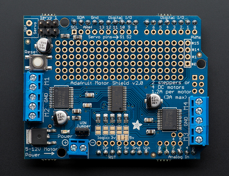 | This Adafruit V1 shield is legacy since this shield is upgraded in favor of V2 since 2014. Playground.arduino shows which pins are taken by the shield. So to drive my chassis I bought a V1 motor driver shield where I better had bought a motor driver module. But my V1 old-timer is cheap and powerful enough for this little robot application. This shield can drive up to 4 DC motors, but I am using only 2 of them (M1&M2: A=black, B=red). Since we are only using Motor1 and Motor2 both the pins DIO 5 (DC Motor #3) an DIO 6 (DC Motor #4) are free for other use. These are both PWM pins.