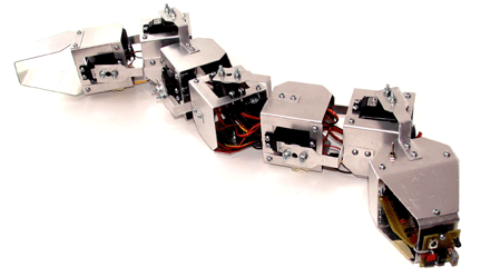 Het basis idee is dat de robot zich voortbeweegt als een slang. In plaats van schubben gebruikt hij rupsbanden of wielen, 3 per vierkant (vijfkant?) segment.