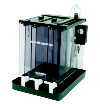 De volgende stap is het op maat maken van een plaatje epoxy positief fotogevoelig printmateriaal (enkelzijdig 529273 €25,03 per 10 st of dubbelzijdig 529206 €28,99 per 10 st) met de tafelschaar 529788-89 €269,- . Het belichten van de printplaten gebeurt met een dubbelzijdige vacuum UV belichtingsbak. De folie wordt met de geprinte kant op de print gelegd. Waar het om gaat is dat er geen lichtdeeltjes onder de toner door mogen kruipen naar de print. Dit wordt in deze belichtingsbak bereikt met een vacuumpomp. Bij enkelzijdig belichten kan ook een kunststof schuimplaatje worden gebruikt om het negatief goed op de print te drukken. De eerste ingebruikname van een etssysteem vereist het maken van een testplaatje om te bepalen hoelang een print belicht moet worden in de UV bak.