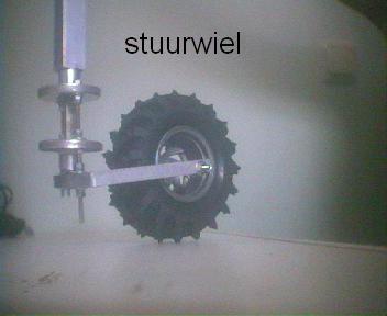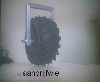 Afijn, de eerste mechanica is gebouwd. Een vrij draaiend volgwiel en de aanzet tot een aandrijvingswiel. De wielen hebben een omtrek van 40 cm en komen uit een modelbouwwinkel. Ze horen bij de 1:10 schaal die standaard is in de wereld van de modelautos en zijn eigenlijk bedoeld als wielen voor een model van een bigweel. Dit betekent dat voor een snelheid van 4,8 km/uur er 200 RPM nodig is. Dit lijkt als maximale snelheid meer dan voldoende, zodat de rest aan toeren van een motor in kracht kan worden omgezet. Dus de vertragingskast bij de motor moet het maximale ideale toerental van de motor terugbrengen tot 200 RPM.
