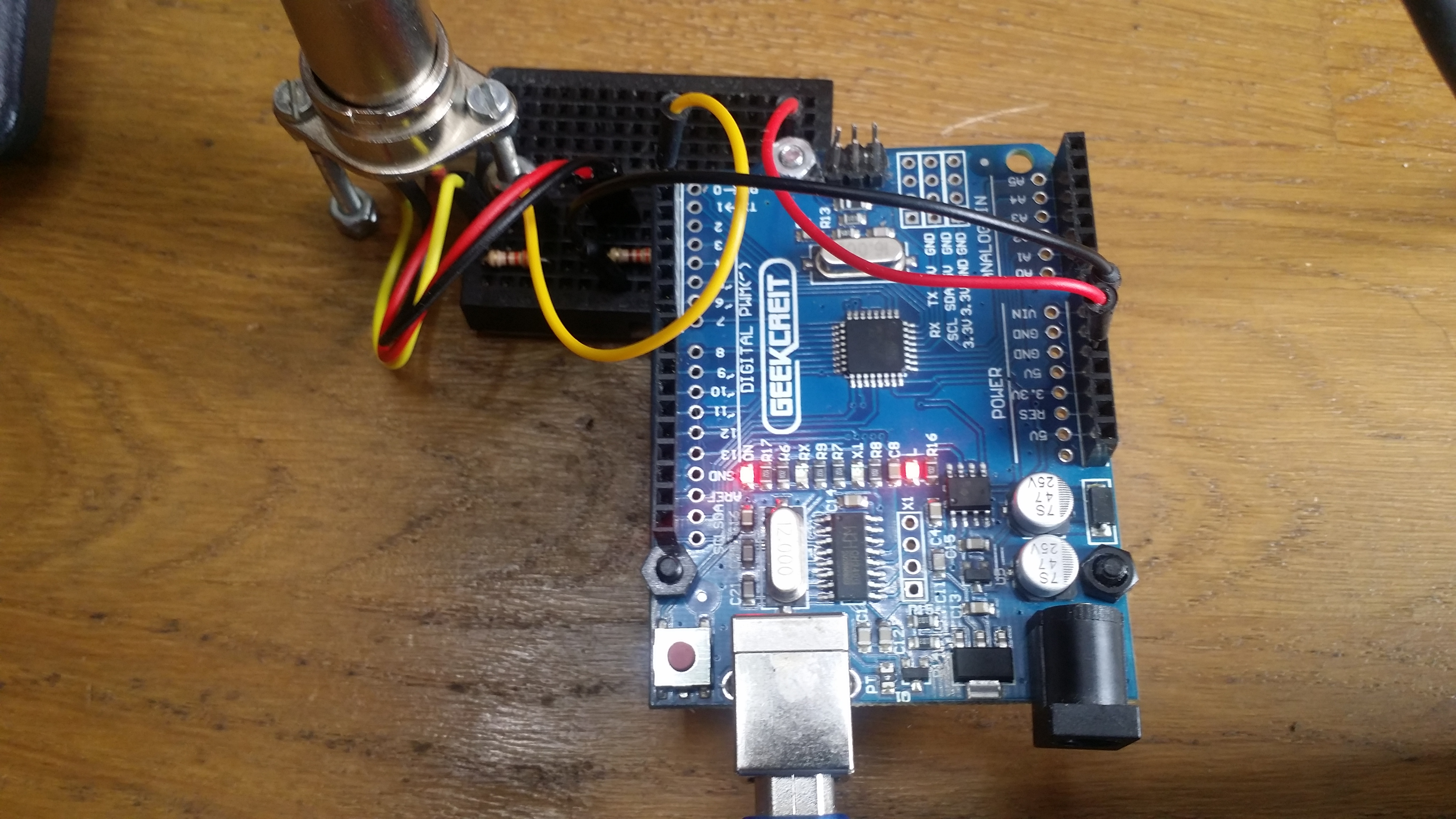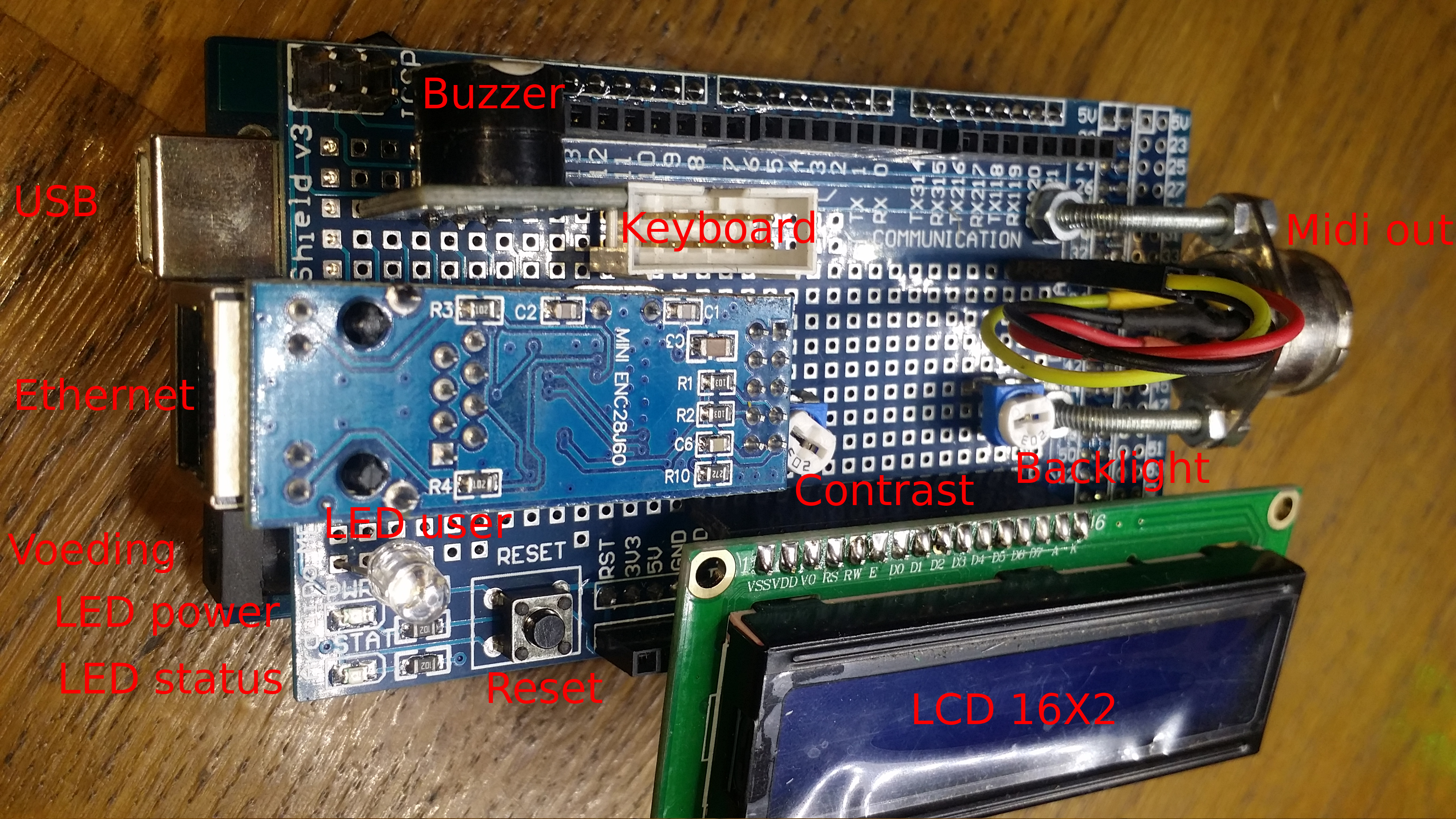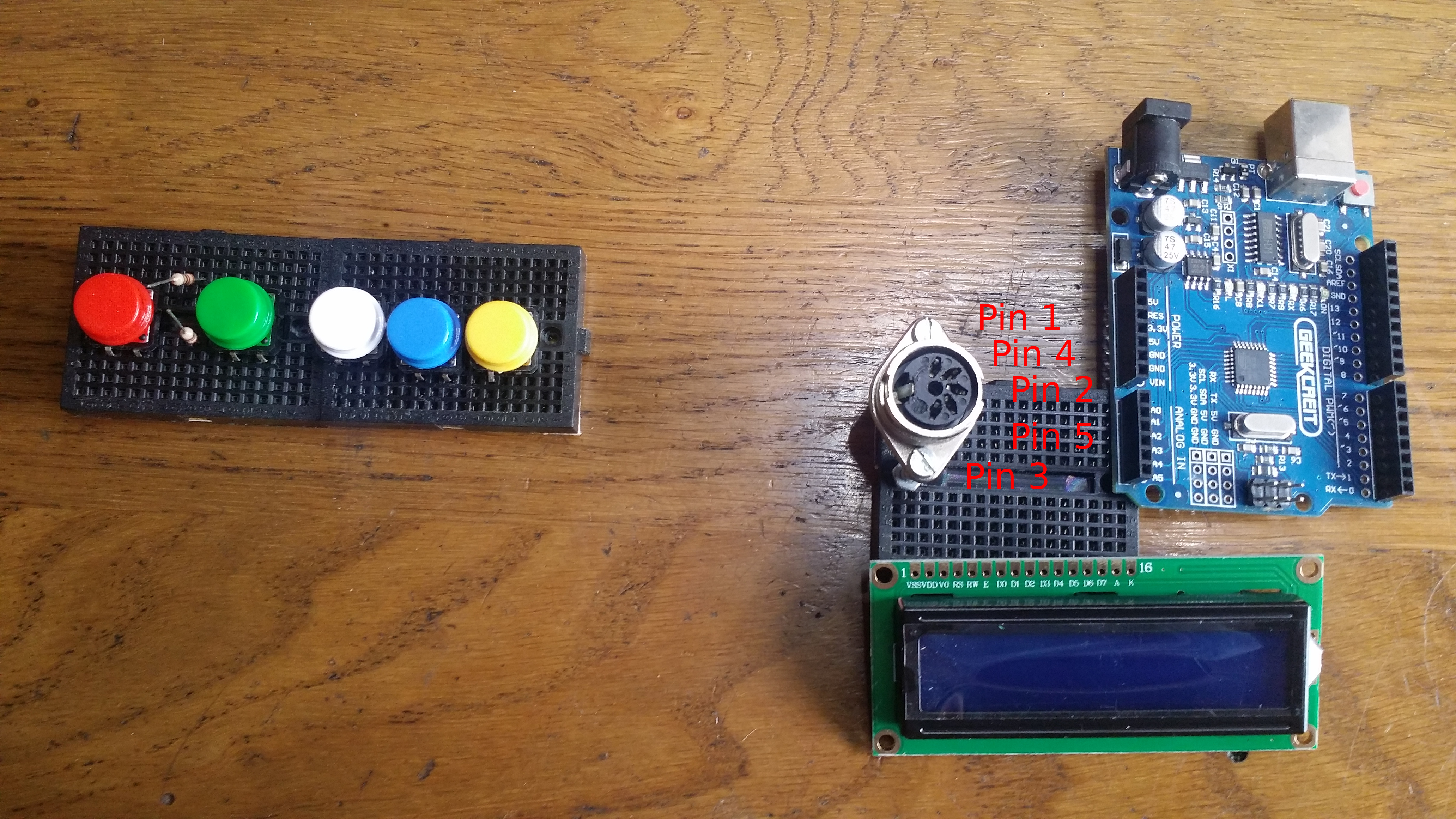 Midi werkt standaard met een DIN-stekker 5-polig chassisdeel, vrouwtje. De out-connector verzorgt de voeding van de communicatie. Pin 4 (rood) staat vast op HIGH via een stroombegrenzend weerstandje. Achter de Midi-in connector moet dan een optocoupler (uitleg) worden gebruikt. Pin 5 (geel) verzorgt de seriële communicatie en kan het beste ook met een stroombegrenzend weerstandje worden verbonden. Hier voldoen 2 weerstandjes van 220Ω (rood, rood, bruin). Zo is de schakeling enigszins beschermd tegen kortsluiting in de kabels. Een DIO-pin van een Arduino om Midi te kunnen genereren (tutorial). Pin 2 (zwart) is verbonden metde aarde.