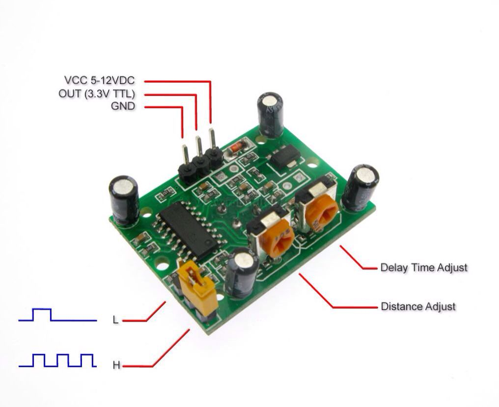 The sensitivity and holding time can be adjusted. Sensitive Setting: turn to right, distance increases (About 7M); turn to left, distance reduce (About 3M). Time Setting: turn to right, time increases (About 300S); turn to left, time reduce (About 7S). There are no flashing LEDs or something. There is not even a power control LED. Digital pulse is HIGH when triggered (motion detected) or pulse is LOW when idle (no motion detected). Pulse lengths are determined by resistors and capacitors on the PCB and differ from sensor to sensor.