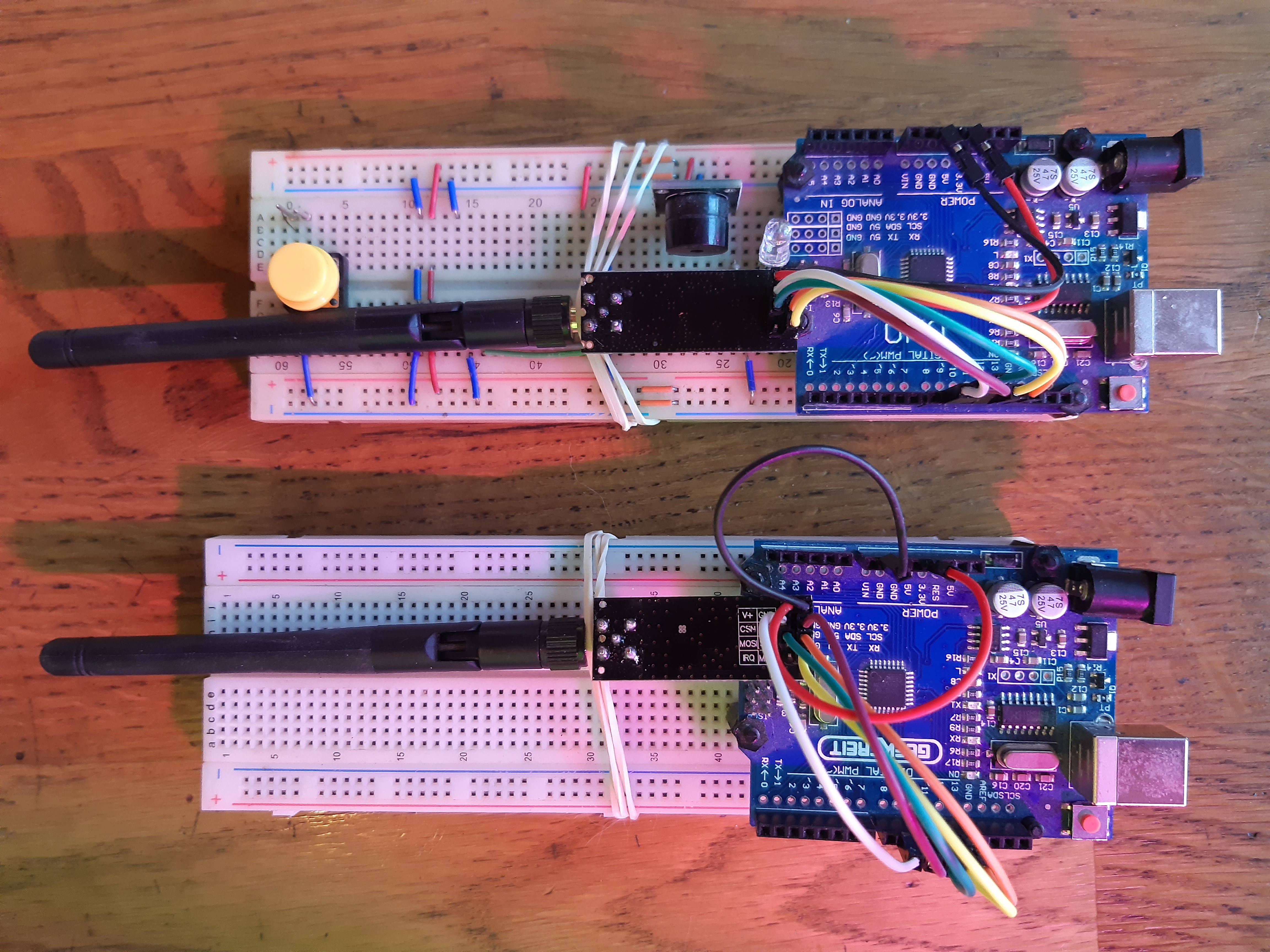 | De aanbevolen bibliotheek is RF24 van Tmrh20 (github). Deze bibliotheek is niet alleen geschikt voor een Arduino. Dit is merkbaar in het moeilijkere gebruik maar de bibliotheek kan wel worden geïnstalleerd vanuit de IDE. Er bestaat op Github een overzicht van de classes. Ik heb eerlijk gezegd nog geen andere serieuze bibliotheek gevonden. Het meest simpele programma dat ik kan vinden is Getting started van tmrh20. Met een simpele setting in het programma wordt er 1 van beide de hoofdzender (ping) die wordt aangesloten op de seriële monitor. De andere transceiver (pong) wordt enkel op de voedingsspanning aangesloten. Door nu een `T` commando te geven zal ping de huidige tijd naar pong sturen. Pong stuurt de ontvangen gegevens dan weer terug en ping laat zien hoe lang de hele cyclus heeft geduurd. |