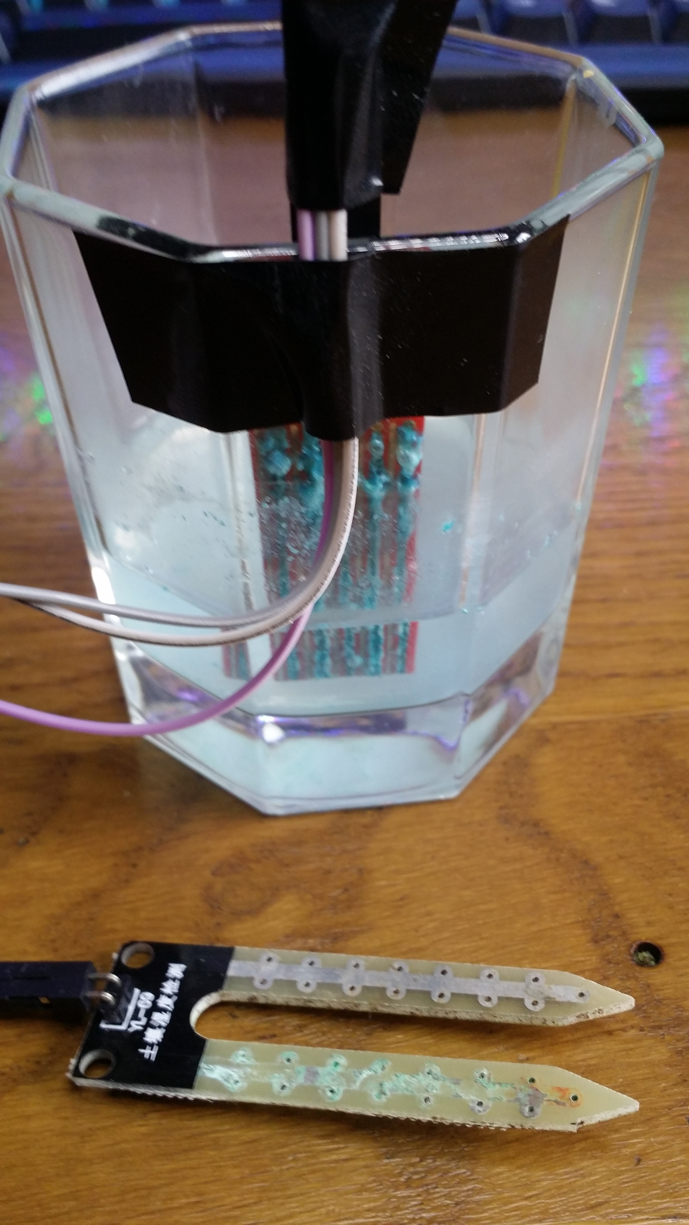 It turns out that chemistry works like predicted. An oxidation process destroys the sensor within days (see image). We can do 2 things to improve the lifespan of this sensor: First: make less measurements. Second is to swap the Vcc and Ground connections per measurement. This should ensure that the metal stays a metal in stead of changing into a salt. Since this sensor has its own electronics it is not possible to swap the pins. All together: this sensor is useless for us. We better use the soil humidity sensor.